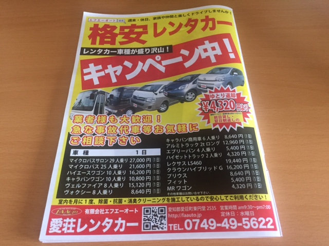 皆さまこんにちは。 昨日、今日とあまり天気が良く無かったですね。 昨日の休みは遠くに出かけず近くで過ごしました。 当店レンタカーは好評でございます。 10人乗りも良く借りていただくのですがなかなかに働く車のレンタカーが好評です。 皆さん頑張っているんですね!僕も頑張ってます! これからレンタカーの貸し出しが多くなってくる時期になってきます。 お早めのご予約お待ちしております! 気持ちよくお使いいただくためにキレイにしてお待ちしておりますね! 最近いただき物の日本酒で友人と品評会を開催しています。 食べ物、飲み物がすすむ季節になりますのでそろそろウォーキングを再開しようと思っています。 バスッと痩せたいですね。でも美味しい物は食べたいですね。